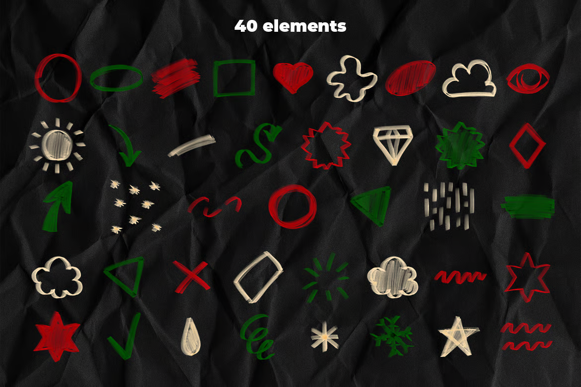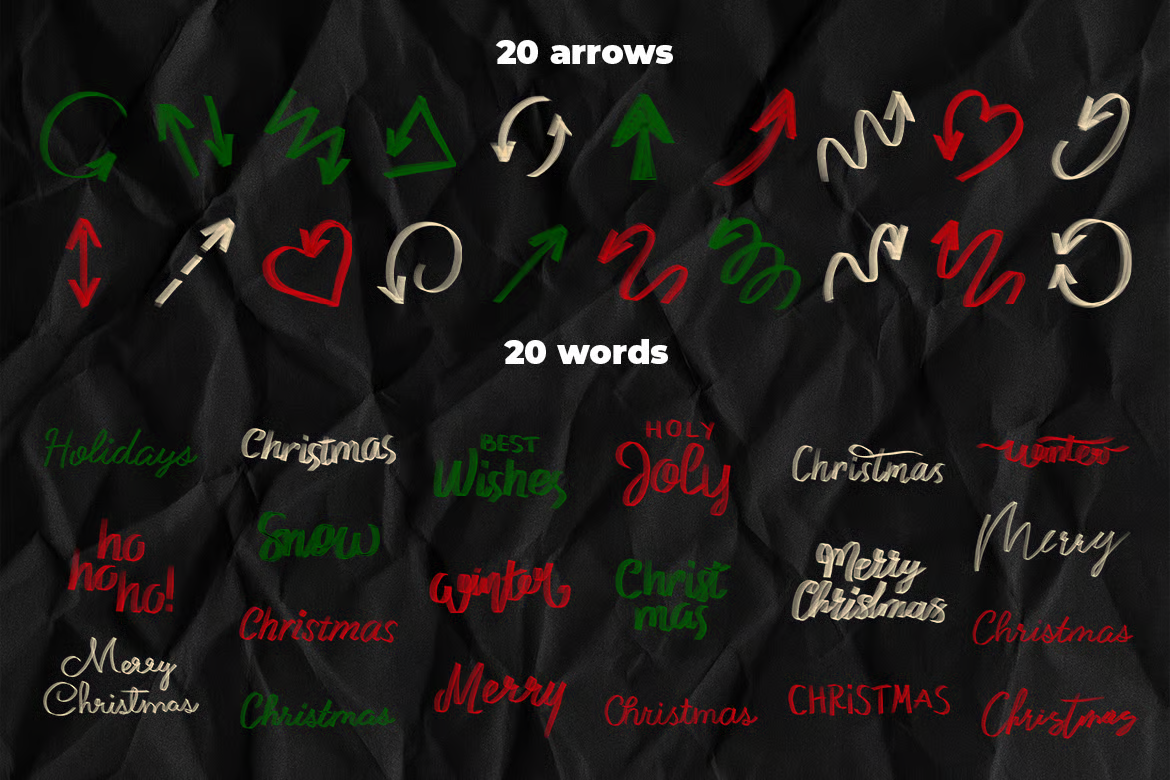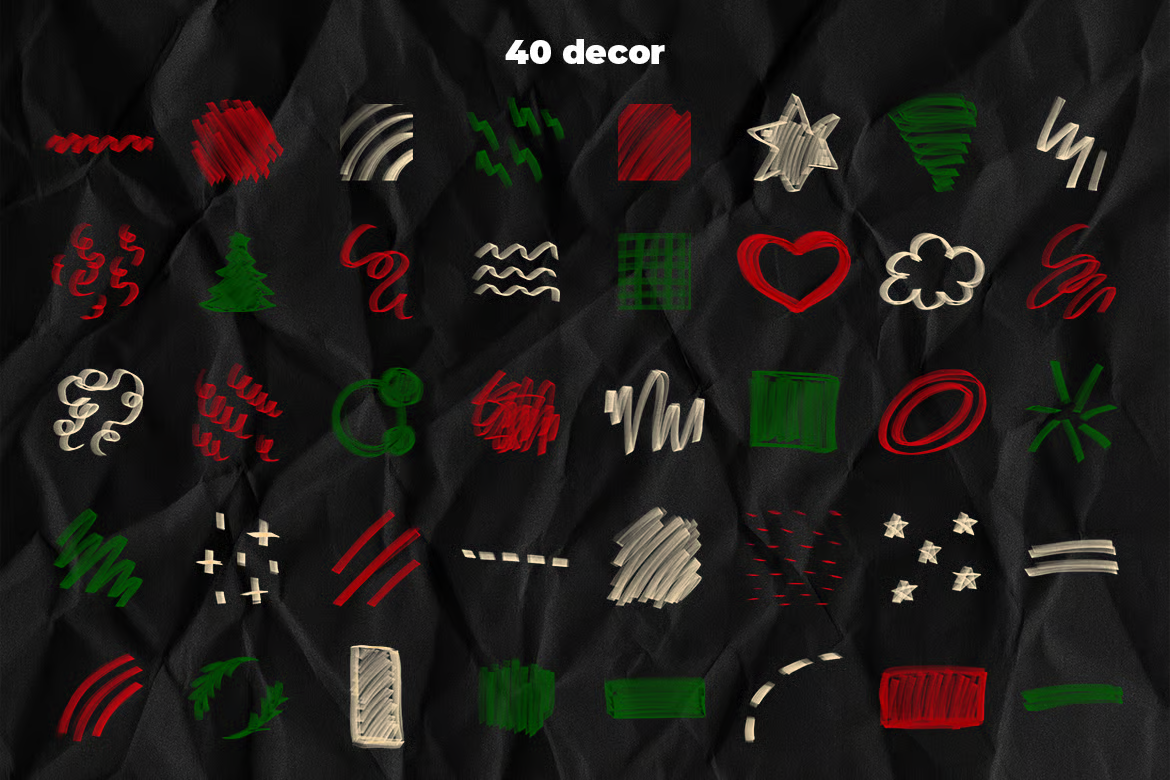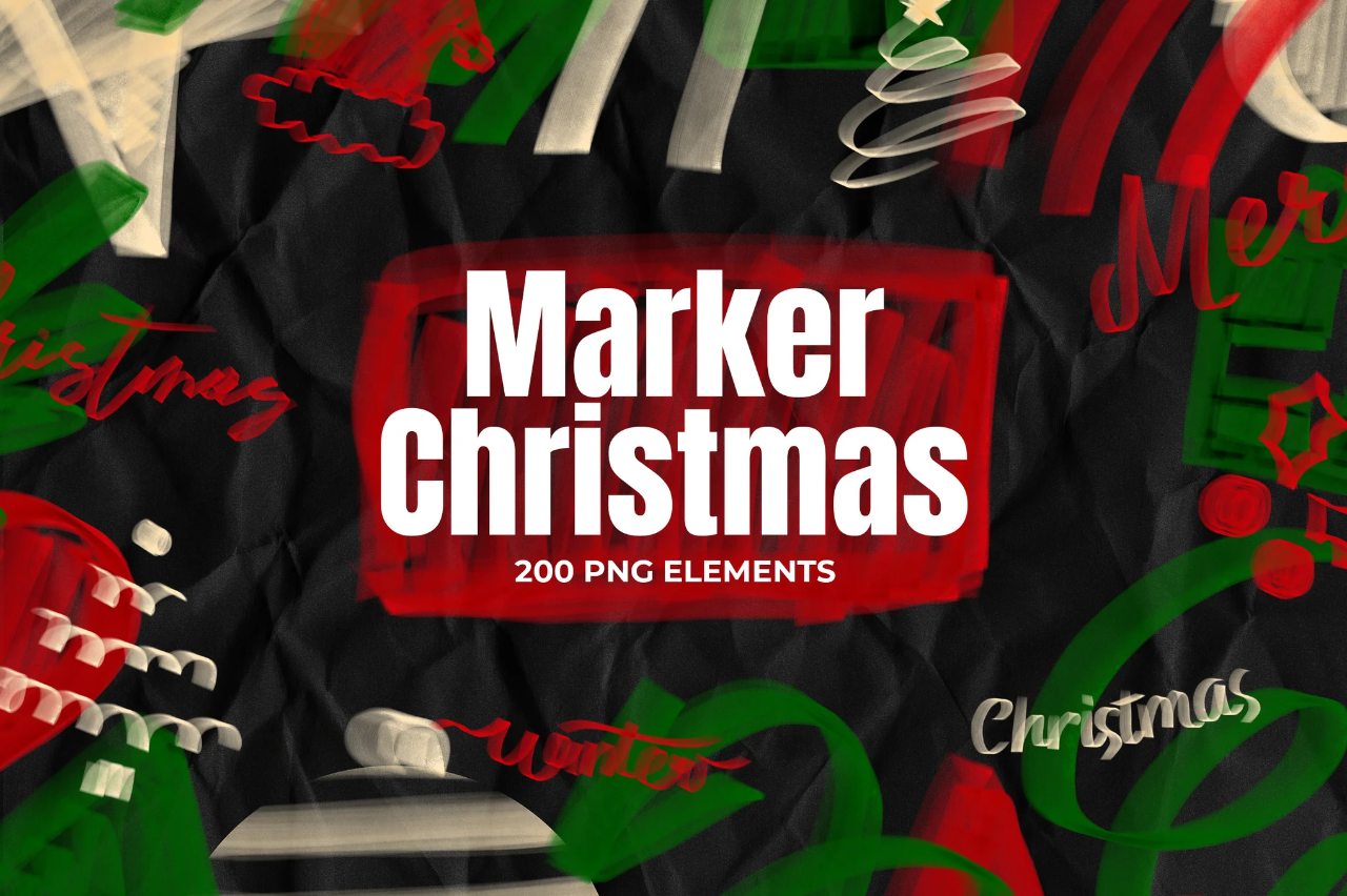 大胆而充满趣味的手绘圣诞马克笔素材,包含笔触、字母和节日涂鸦。鲜艳的红色、绿色和柔和的高光,完美捕捉了节日的活力氛围。非常适合用于创作欢快的海报、礼品标签、社交媒体图片和创意版面设计。