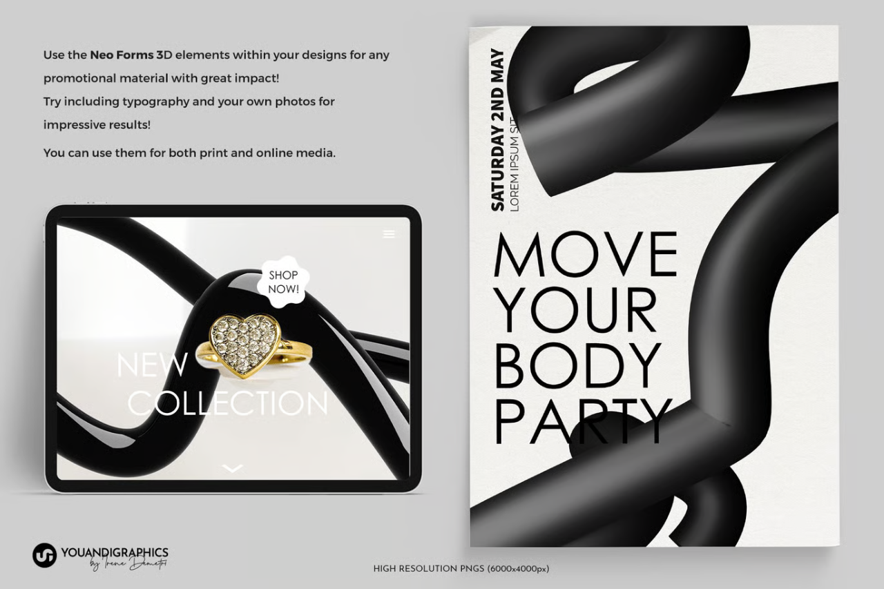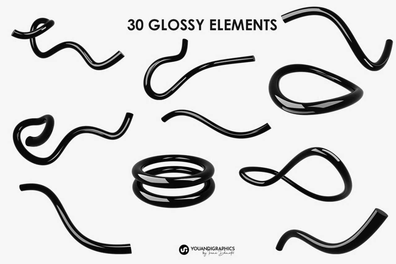 一套包含 60 个3D 渲染抽象元素的合集,提供高分辨率 PNG 文件,背景透明,并有光泽和哑光两种表面处理效果。